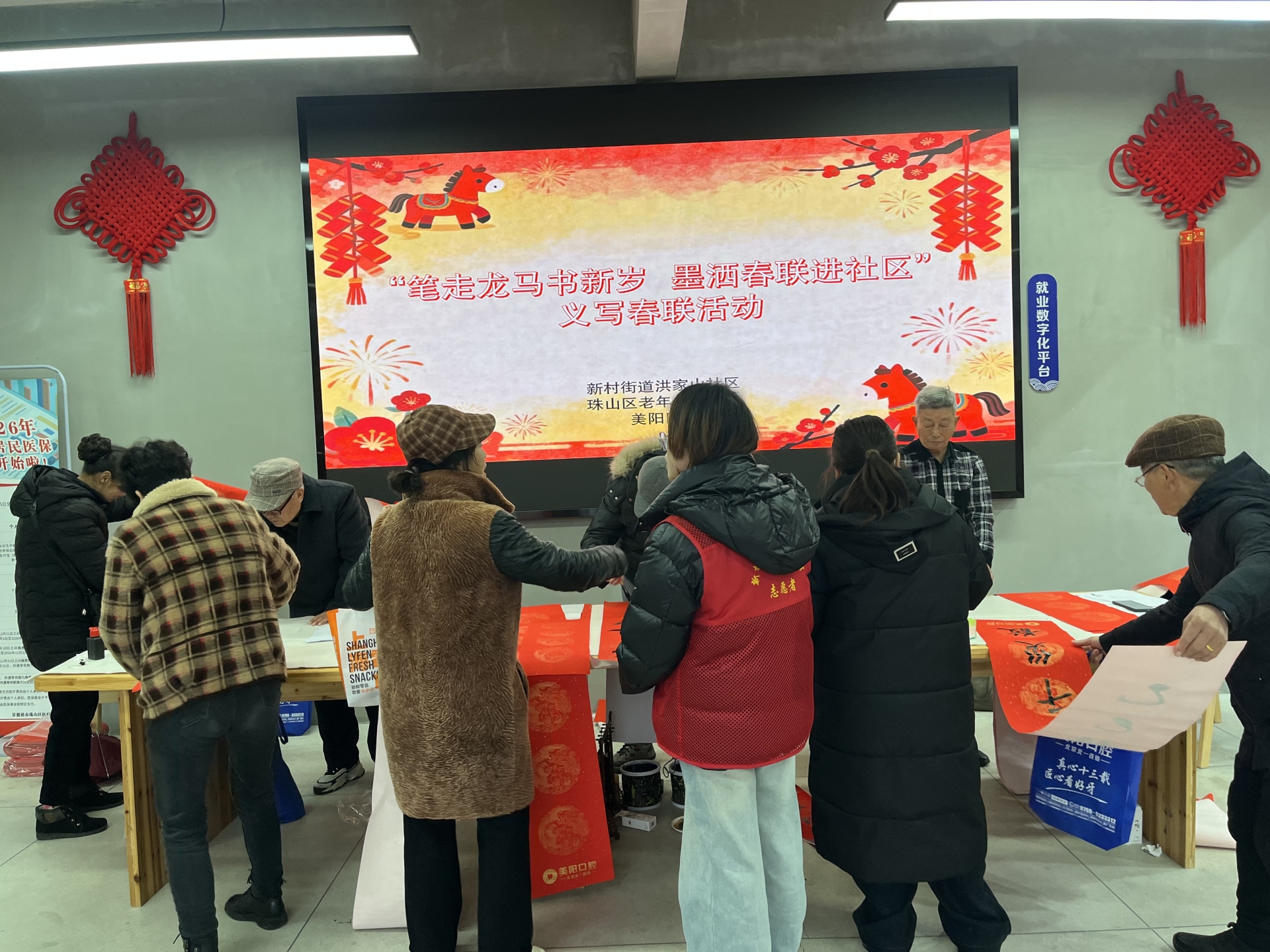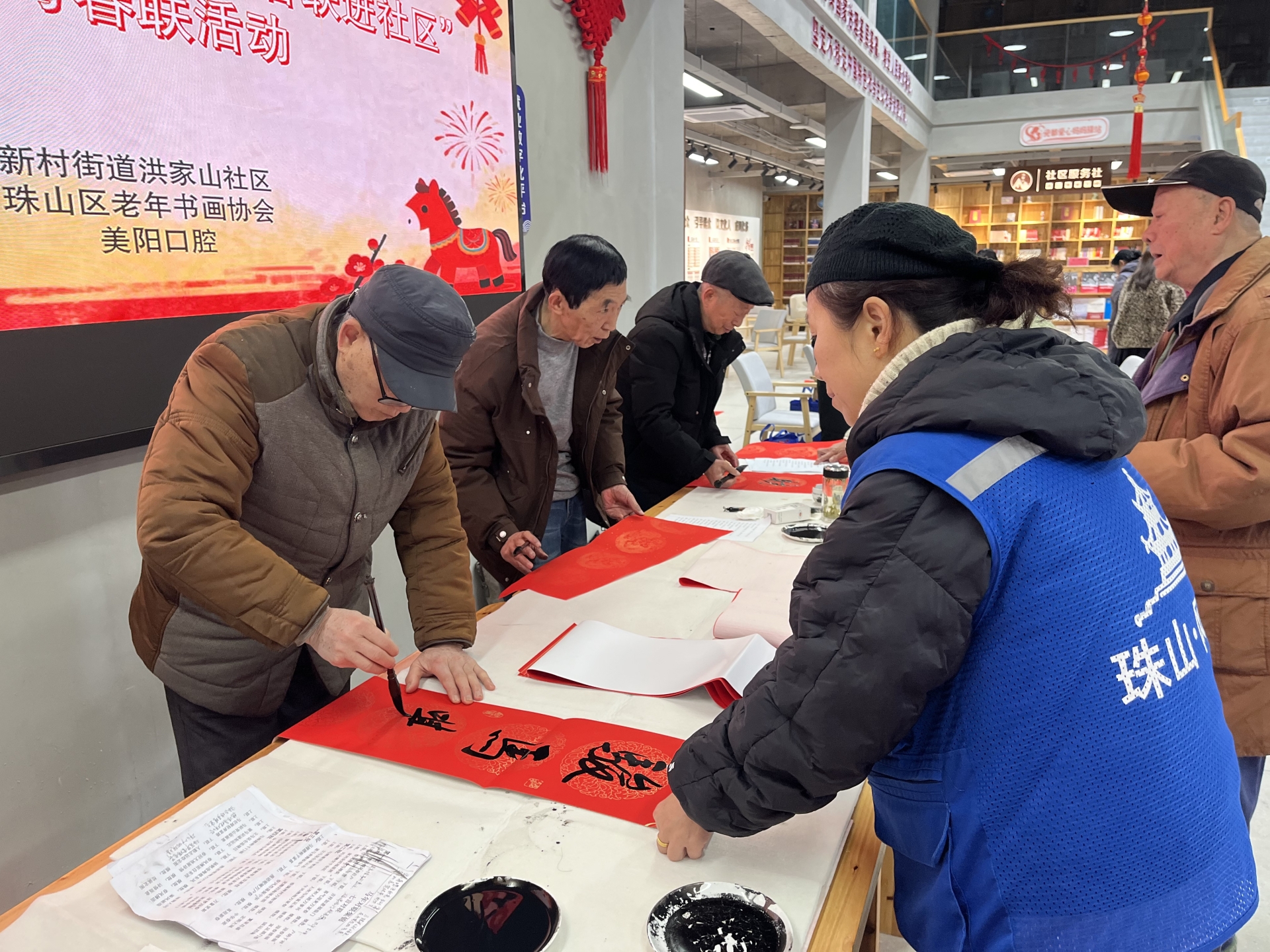 新春将至,年味渐浓。2月6日上午9时,洪家山社区党群服务中心内墨香四溢、暖意融融,“笔走龙马书新岁,墨洒春联进社区”义写春联活动如期举行。社区特邀请珠山区老年书画协会成员挥毫泼墨,将真挚的新春祝福凝于笔端,为居民们送上了一份满载传统文化韵味的新年厚礼。