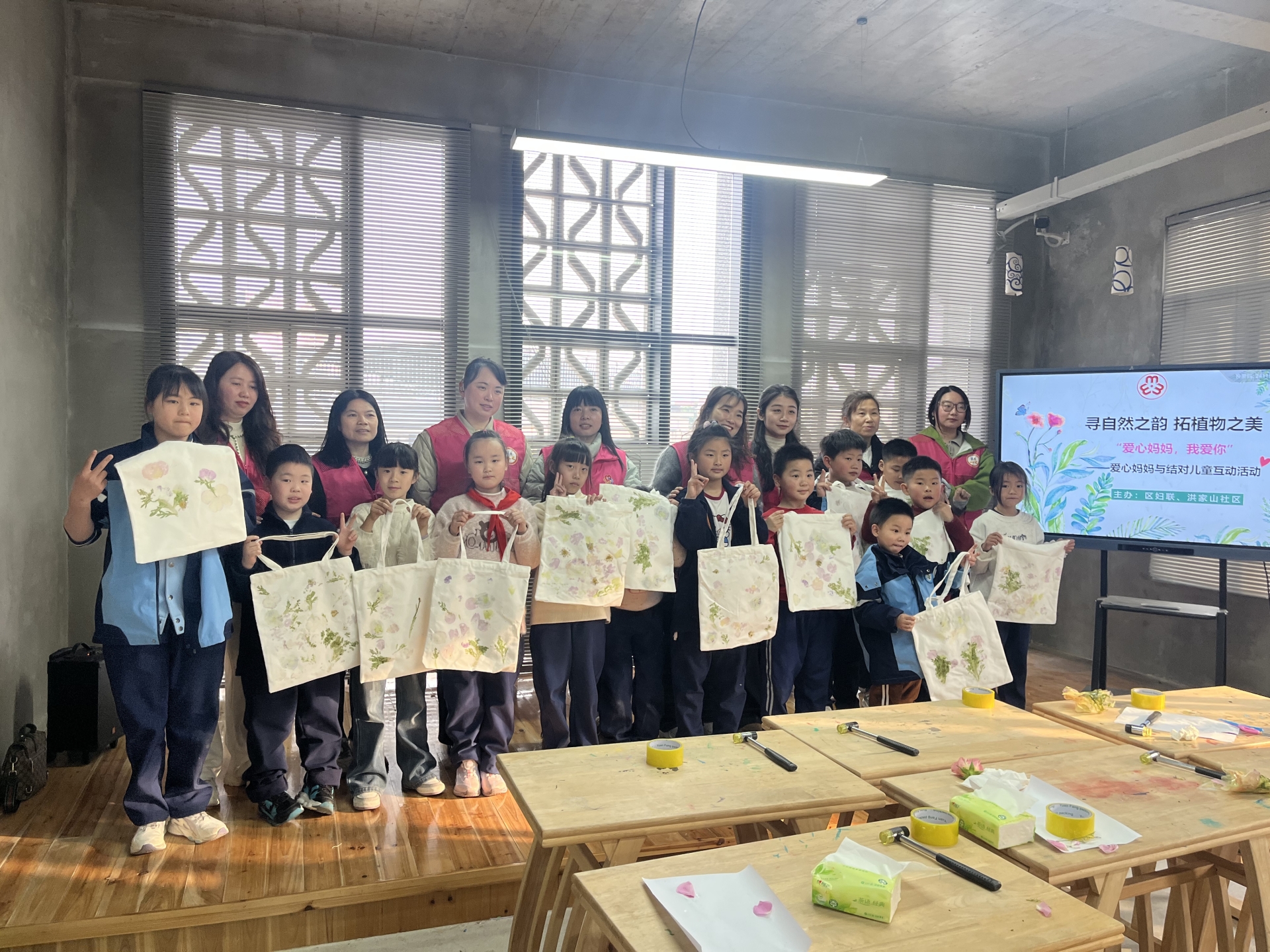 活动现场春意融融、爱意满满。在志愿者的引导下,大家共同认识树叶、花草等自然材料,了解植物拓染的基本知识与制作技巧。爱心妈妈们俯身陪伴、耐心指导,与孩子们大手牵小手,一起选材、构图、敲打、上色,将春日植物的纹理与色彩定格在布袋上。一片片绿叶、一朵朵小花,在指尖化作独一无二的作品,每一件都承载着童真与温情。